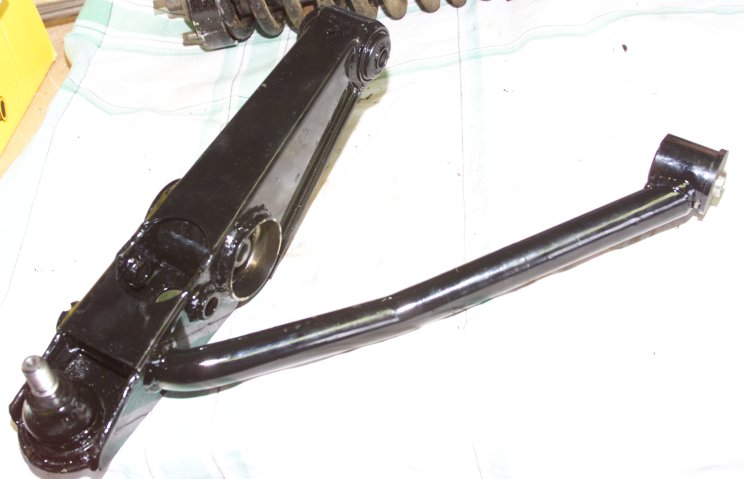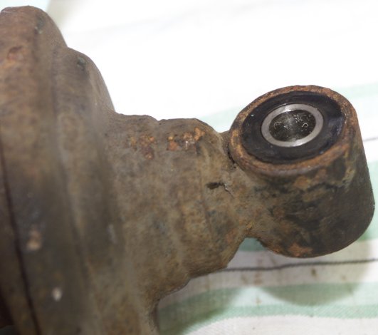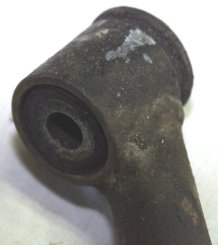 The bush in the shock-absorber has failed and has been removed. The wishbone bushes are in much better condition but the front mounted one is horrible in construction. This has, in fact, been modified in later V8 Esprits (circa: April 1998) to a split-bush arrangement because there was too much movement of the wishbone under braking due to the larger tyres fitted to the V8.