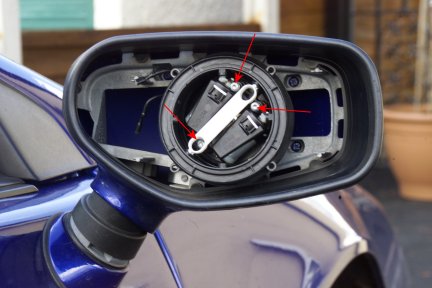 The mirror motors need to be removed and disconnected via the three screws as indicated.