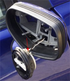 There is a small, plastic nipple behind the mirror that needs to pushed in the direction towards the car (in this case to the left). If you're removing the left hand door mirror, slide this to the left too but remember that this is the direction away from the car.