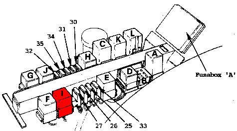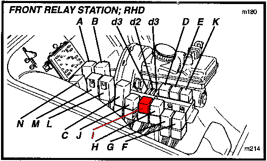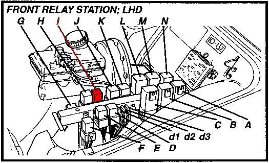The relay you need to change is relay "I" within the front storage bay. On right-hand drive cars the relay is here, highlighted in red: